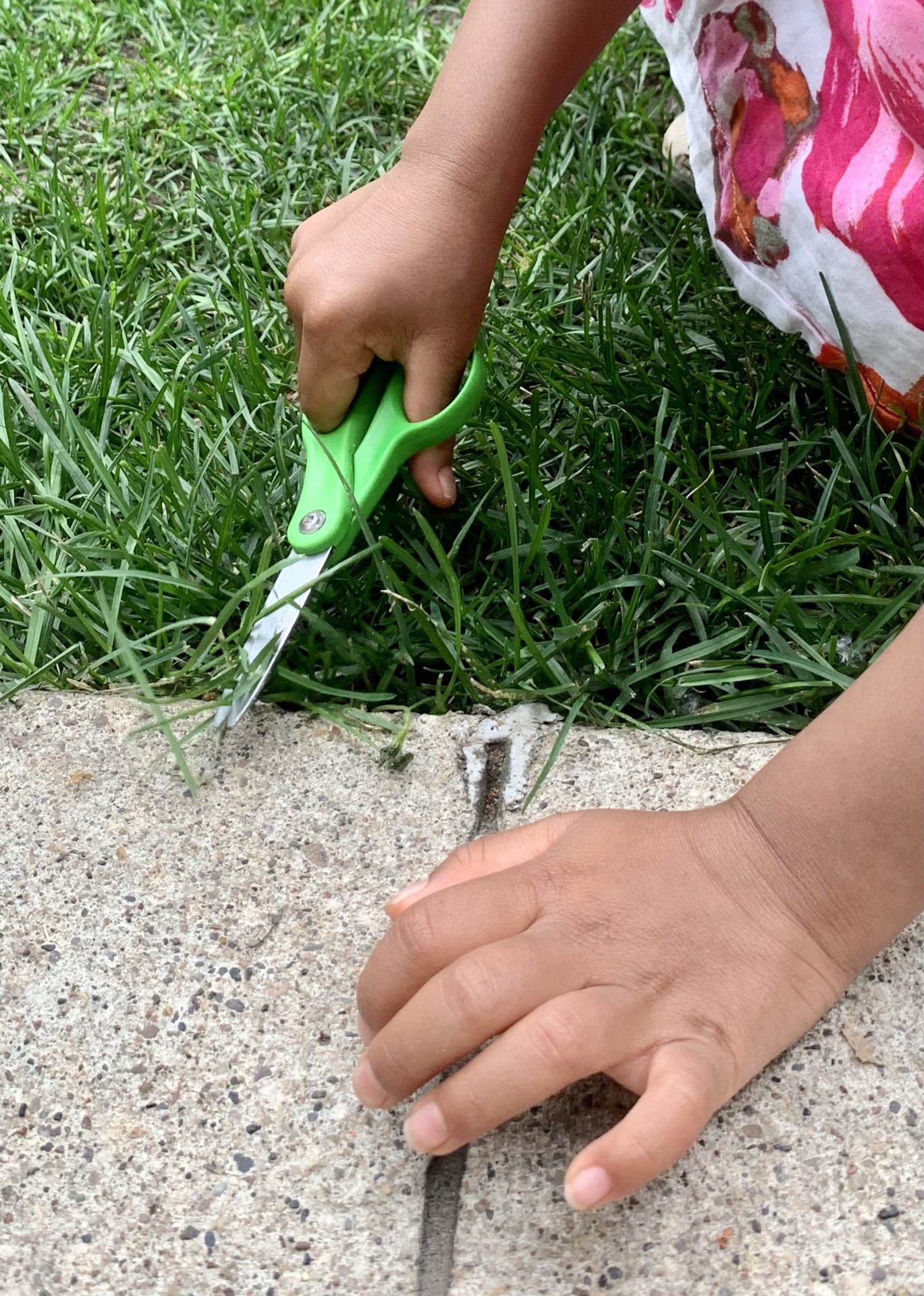 Find a safe spot with grass and let your child know they have an important job: “The grass is getting long—can you help trim it?” - Show your child how to hold the scissors.