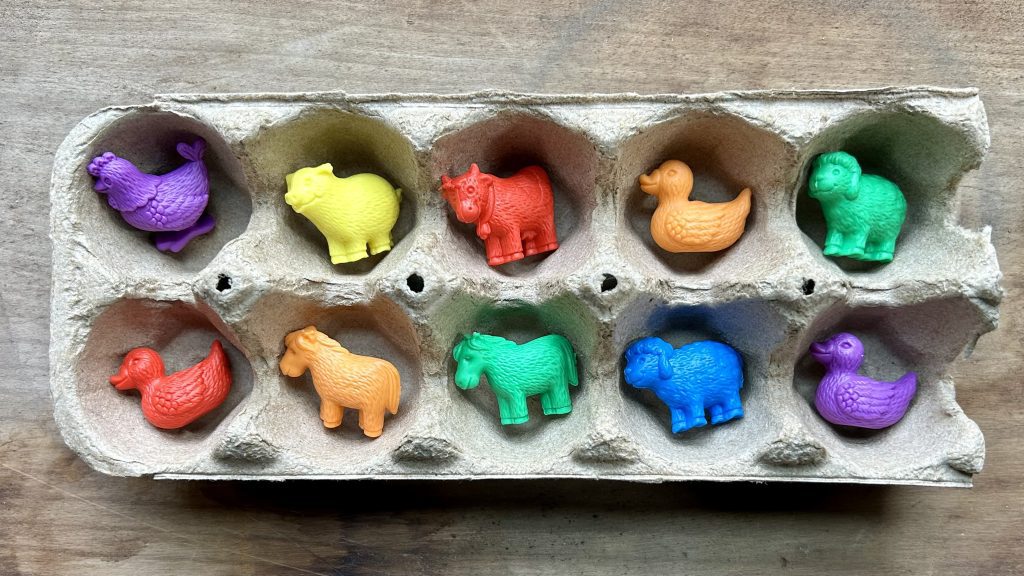 The great thing about ten frames is that you don’t need to buy anything special. You can make one at home using things you already have. Everyday materials make wonderful ten frames! You can cut or tape an egg carton down to ten paces. You can use a muffin tin or an ice cube tray—each little space becomes a “frame” for one object. You can even make one with tape on your table or floor, or draw boxes with chalk on the sidewalk.